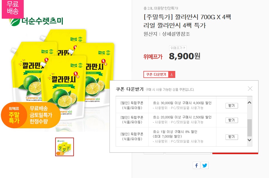 위메프에서 깔라만시 700G X 4팩을 8900원에 무료배송으로 팔고있습니다. 추가로 쿠폰 적용이 가능하여 위에 보이