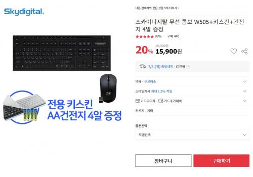 옥션에서 스카이디지탈 무선 콤보 W505+키스킨+건전지 4알을 15900원에 무료배송으로 팔고있습니다. 추가로 쿠폰