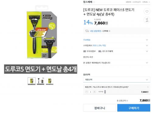 지마켓에서 도루코 페이스 5 면도기 + 면도날 총4개를 7860원에 무료배송으로 팔고있습니다. 면도기 필요하셧던분