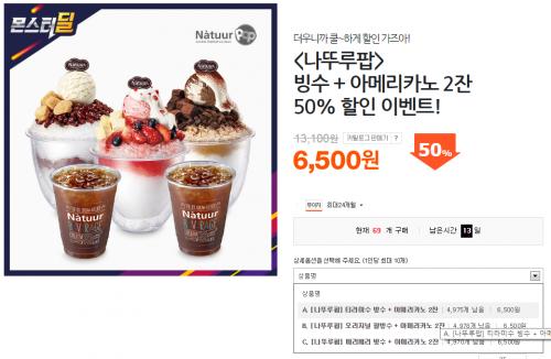 티몬에서 나뚜루팝 빙수 3종류 중 택1 + 아메리카노 2잔