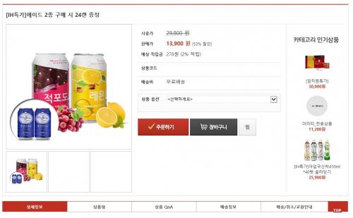 적포도에이드나 레몬에이드 24캔 주문 시 초정탄산수 355ml 24캔 추가로 준다네요.