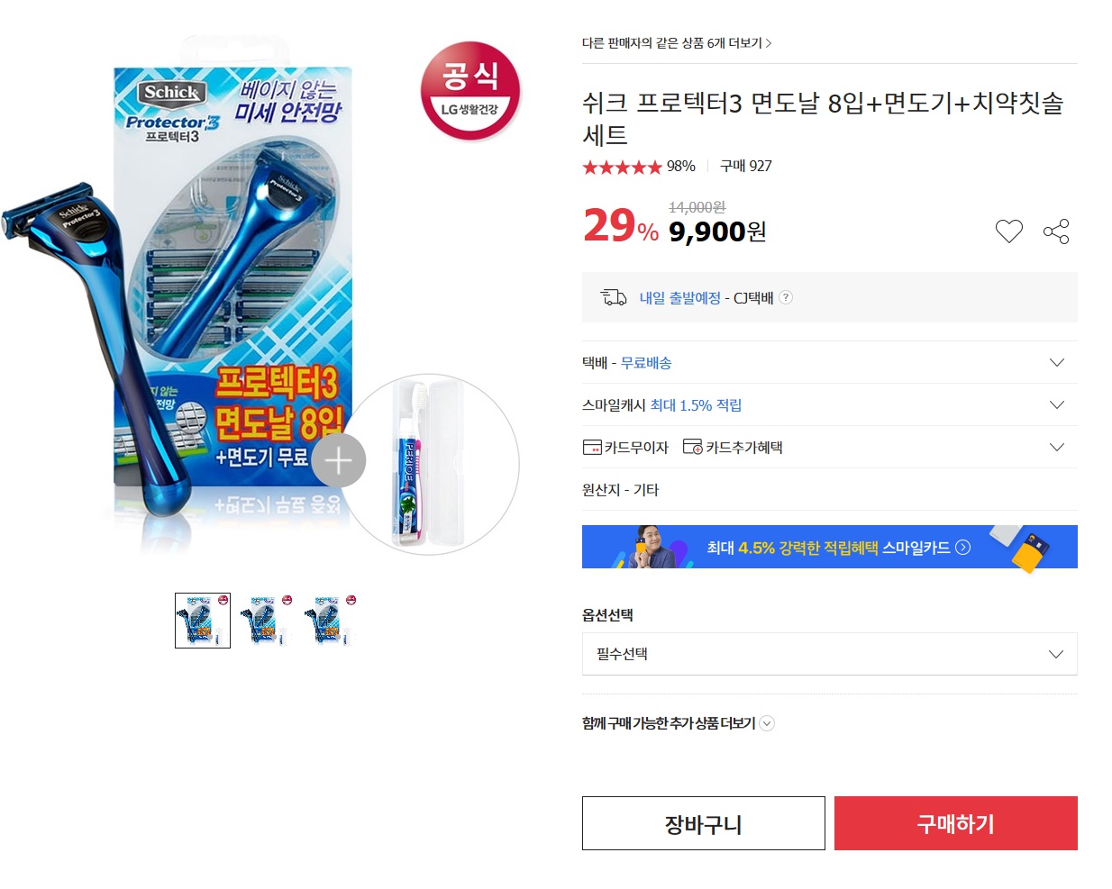 옥션에서 쉬크 프로텍터3 면도기 + 면도날 8입 + 여행용 칫솔치약세트를 9900원에 무료배송으로 팔고있습니다. 추