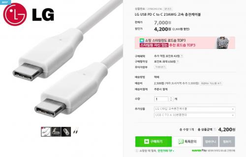 [네이버쇼핑] LG USB PD C to C 23AWG 고속 충전케이블 1M (4,200원/2,500원)