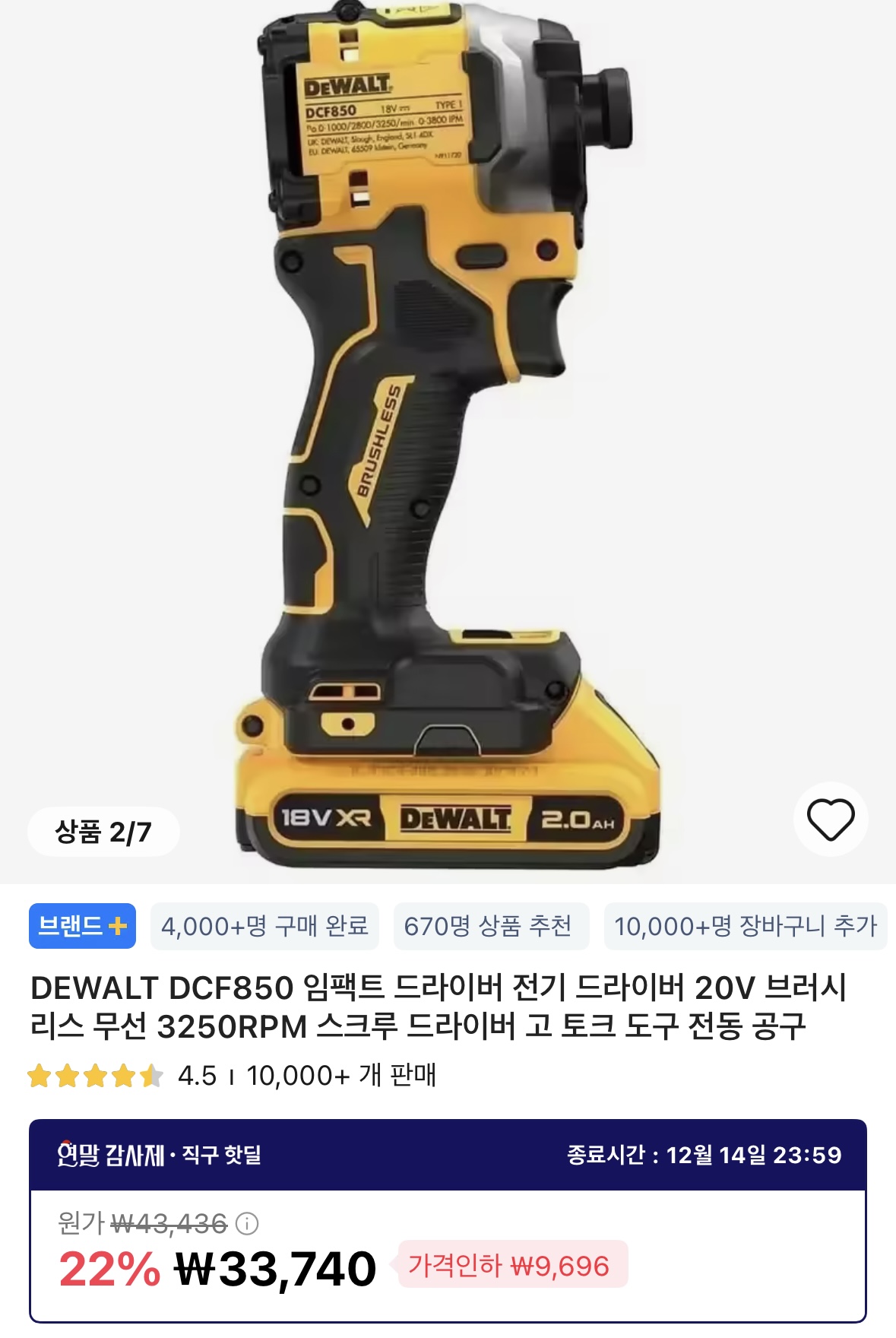 [알리] DEWALT DCF850 20V 임팩트 드라이버 (29,203원/무료)