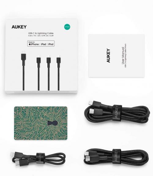 Aukey의 MFi 인증 USB-C to 애플 라이트닝 케이블 3개 묶음 상품입니다.