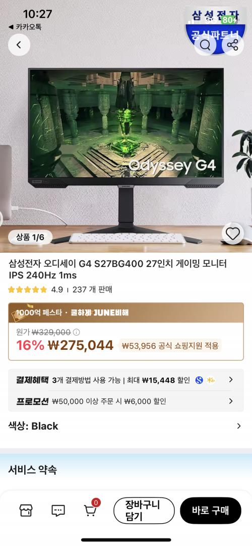 [알리] 삼성전자 오디세이 G4 S27BG400 27인치 게이밍 모니터 IPS 240Hz 1ms (253,596원/무료)