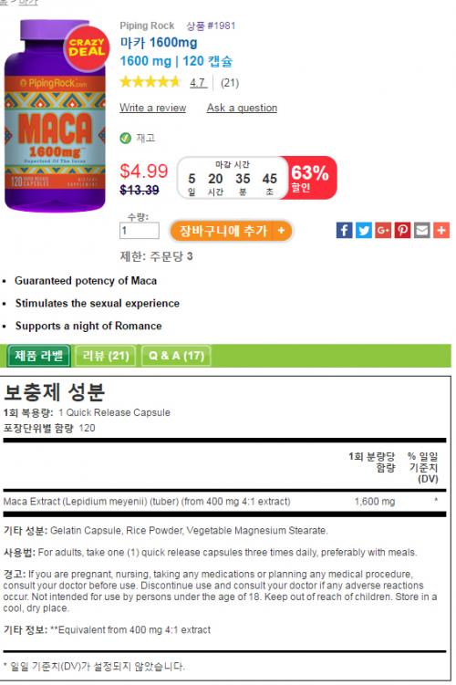 장바구니 담아 놨던 마카 1600밀리 120알 제품이 크레이지 딜이 되어 글 올립니다 ^^