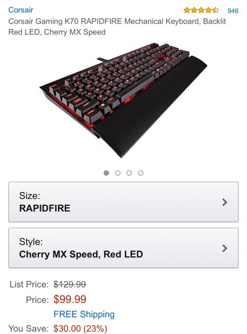커세어 K70 RAPIDFIRE의 Red LED 버전이 낙타 최저가인 $99.99로 떨어졌네요