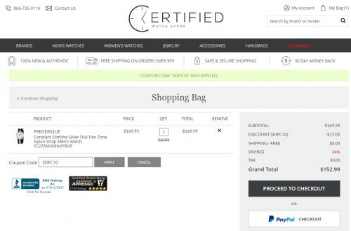 certifiedwatchstore 여기서 10% 세일 들어 가네요.. 그래서 169.99 에서 할인 하면 152.9 불 입니다.