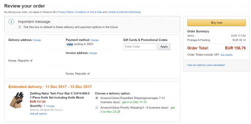 한국까지 보내는 경우 가격은 117.64 유로 배송료는 39.12유로입니다. (상품 가격이 150달러 이하라 무관세)
