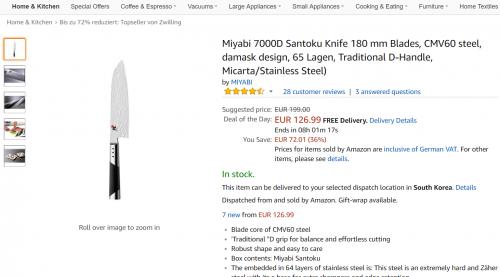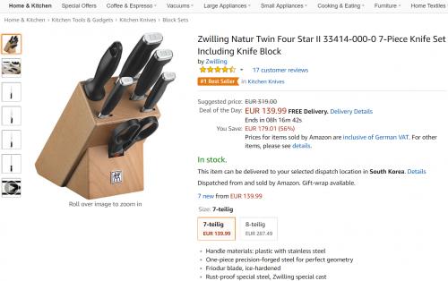 독마존에서 쌍동이 칼로 유명한 Zwilling 4스타 (최고 등급 바로 아래 등급이라고 합니다.) 타임 세일 중입니다.