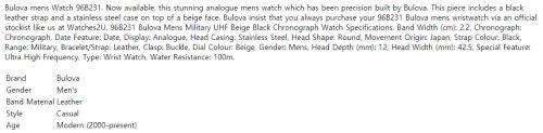 스펙 첨부 이미지가 너무 작게 올라갔네요.클릭하시면 됩니다. 100미터 방수, 42.5밀리 다이얼, 22밀리 가죽밴드, 12밀리 높이입니다. 글래스는 돔형 미네랄입니다. | ||