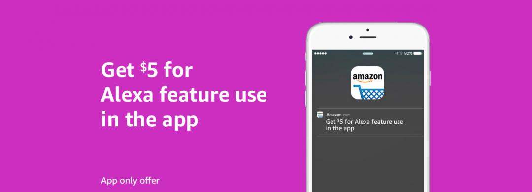 Amazon customers who use Alexa feature in Amazon's Mobile shopping app can get a $5 promotional code off their next qualifying $10 order in app by June 21, 2019.