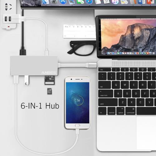 USB C Hub, ANBES 6 in 1 USB C Adapter 3.1 Type C Charging Port, 4K Output Port, TF/SD Card Reader, 2 USB 3.0 Ports for MacBook Pro 2015/2016/2017 and More Type C Devices (Silver) $6.20