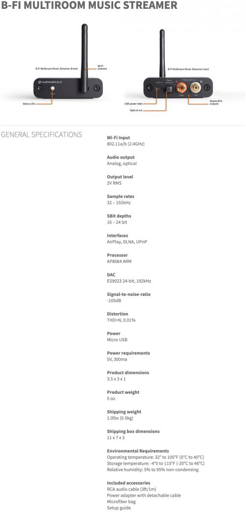 상세 스펙: https://audioengineusa.com/product_tech_specs/b-fi-multiroom-music-streamer/