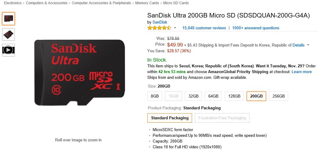 작년에도 몇 번 싸게 풀렸던 싼디스크의 마이크로SD 200GB 제품이고,