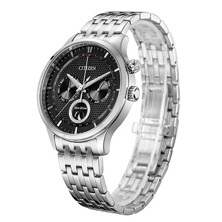 반달 모양의 포인터가 날짜를 가리키고 서브다이얼 세 개에 각각 요일표시, 월표시, 달 위상 표시가 들어가 있습니다.