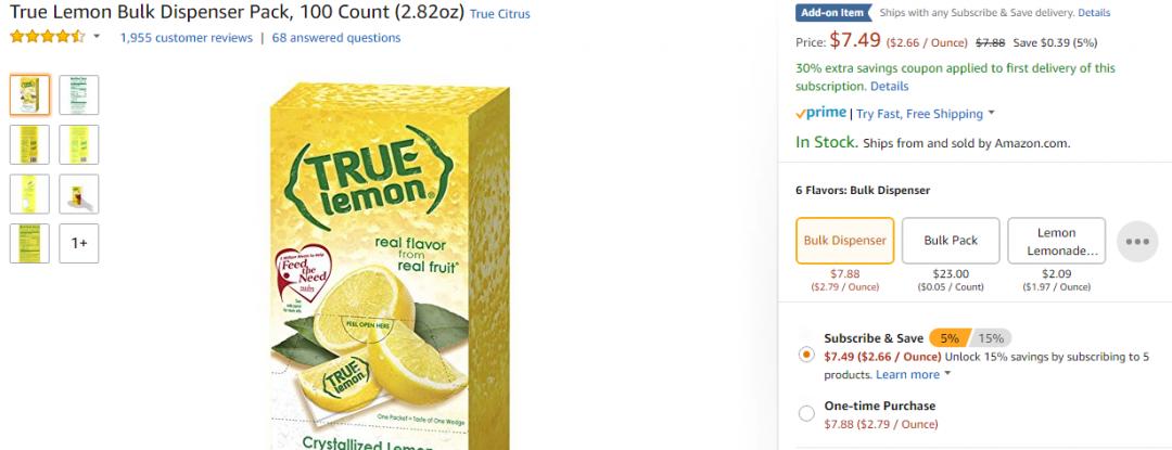 [amazon] True Lemon Bulk Dispenser Pack, 100 Count (2.82oz) ($5.52/프라임 프리)