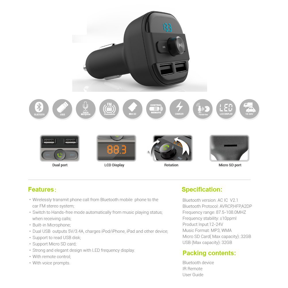 휴대전화 등의 블루투스를 FM 라디오 주파수로 송출해주는 차량용 트랜스미터 입니다.