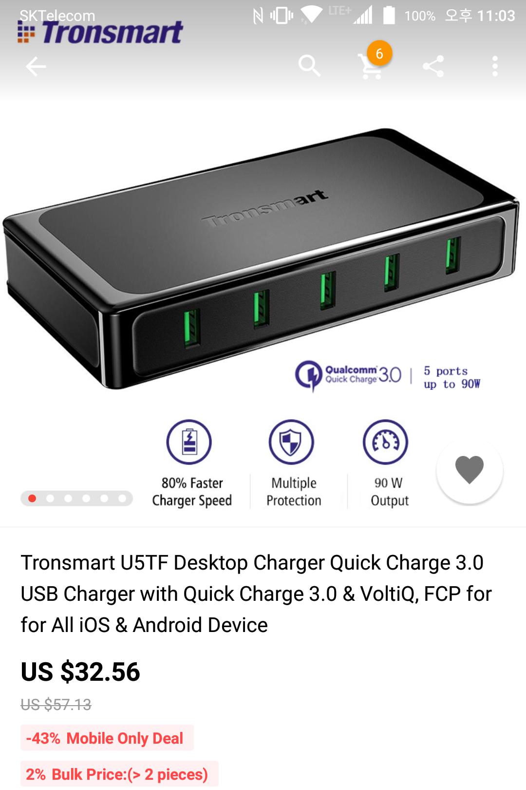 [AliExpress App] Tronsmart U5TF Quick Charge 3.0 USB 5-port Charger ($32.56 / 한국직배 무료) > 해외핫딜