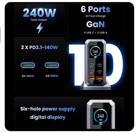바로가기 : 240W GaN 충전기 PD3.1 140W USB 유형 C 6 포트 PPS PD MacBook 노트북 태블릿 iPhone Samsung 용 데스크탑 고속 충전 스테이션
