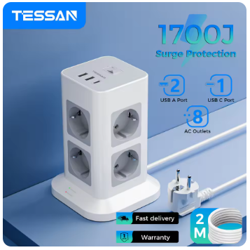 [알리익스프레스] TESSAN 타워 전원 스트립 멀티 콘센트(2개의 USB +1 유형 C 2M 연장 케이블 포함) / ($15.39 /무료)