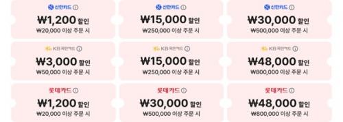 - 100달러 이상 구매 시, 15달러 즉시 할인: 신한카드, BCMastercard, NH농협카드, 하나 VISA 카드, 신한 Mastercard, 우리 Mastercard, 신한 VISA 카드