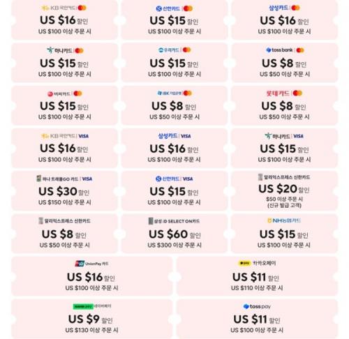 - 50달러 이상 구매 시, 8달러 즉시 할인: 토스뱅크 Mastercard, IBK Mastercard, 롯데 Mastercard,알리익스프레스 신한카드