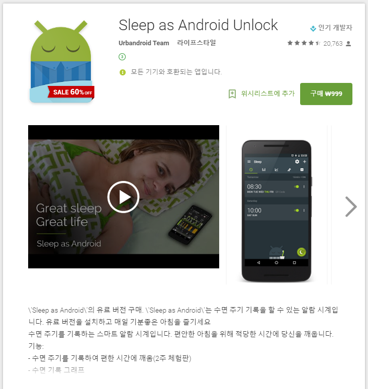 바로 구매하시지 말고 Sleep as Android를 써보신 후에 괜찮다면 언락을 구매해보시는 것도 괜찮겠습니다.