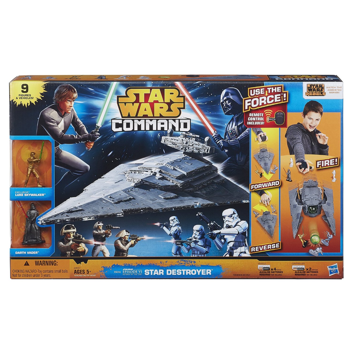 - Includes Luke Skywalker (Exclusive), Darth Vader, 3 Rebel Soldiers, 3 Stormtroopers, Star Destroyer vehicle, 4 Energy Blast Balls and Command Controller