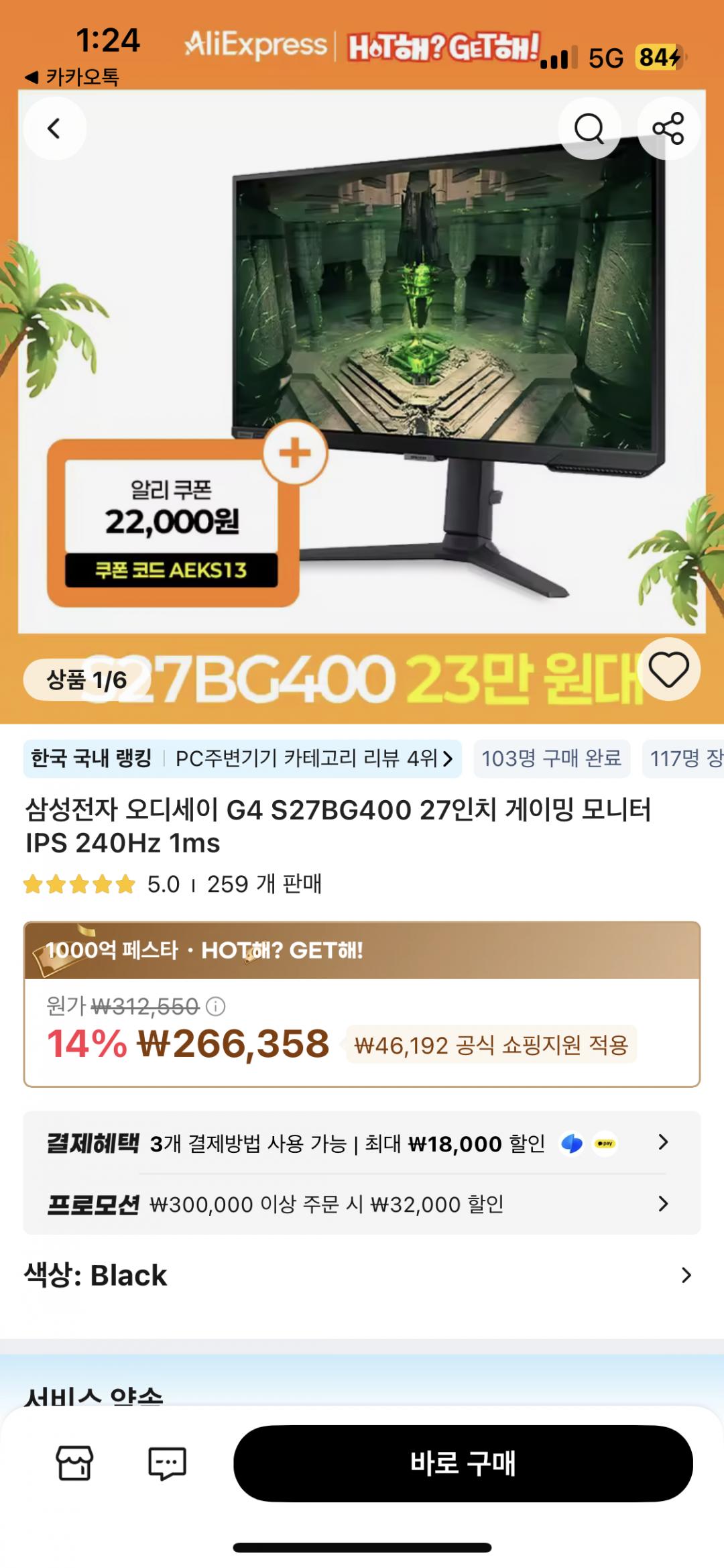 [알리] 삼성 게이밍 모니터 오디세이 G4 S27BG400 (238,358원/무료)
