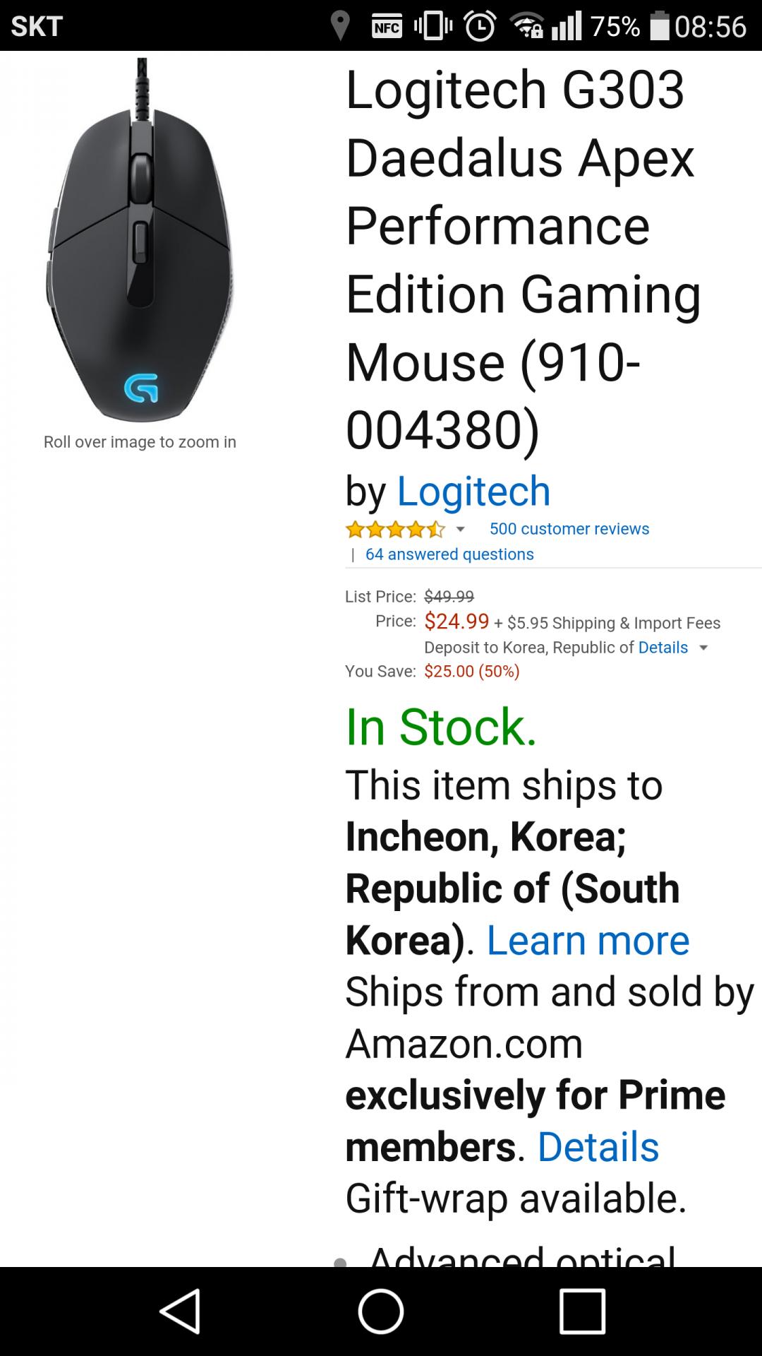 [Amazon] Logitech G303 Gaming Mouse 프라임 조건 (24.99/5.95)