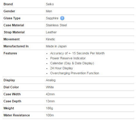 주요 스펙은 사파이어 글라스, 케이스 42mm(용두포함), 두깨 13mm, 10기압(100m)방수, 키네틱 드라이브, 문페이즈, 일계/요일계(데이데이트), 24시간계, 파워리저브입니다.