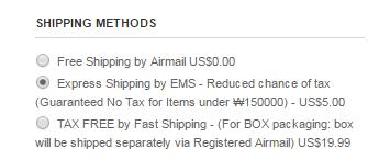 프리쉽, EMS 특송, 패스트쉬핑이 있습니다. 패스트쉬핑은 면세라고 하는데 면세 아닙니다. 직배 하시면 관세청에서 문자나 메일로 관세 납부하라고 연락이 옵니다.^^