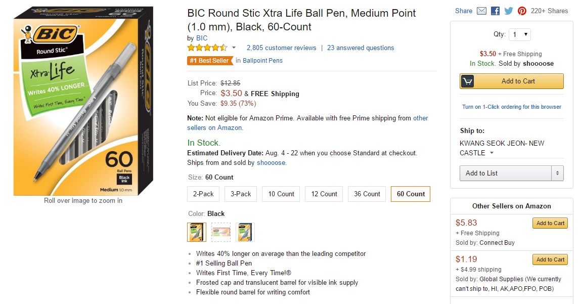 [amazon] BIC Round Stic 볼펜 60개 ( $3.5/미국내 무료)