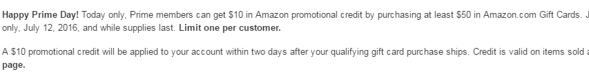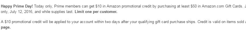 This offer is not valid on (1) Amazon.com Email GCs or Amazon.com Gift Card Balance Reloads that are purchased prior to July 12, 2016 or purchased on July 12, 2016 but scheduled for delivery after July 12, 2016 or (2) any Amazon.com GCs delivered as an Allowance.