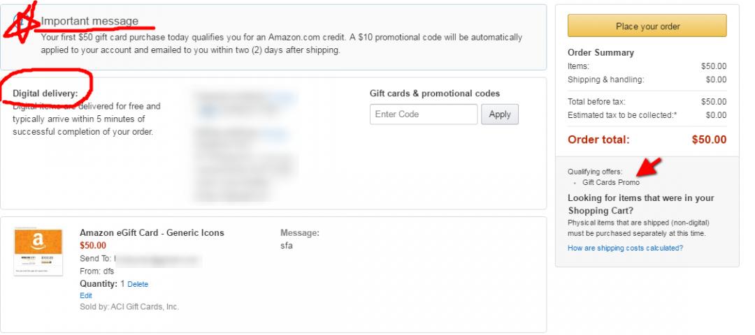 예를 들어 물건값이 100불이면 100불 -  50불(기프트카드) - 10불(프로모션) = 40불 40불만 추가 결제하시면 됩니다