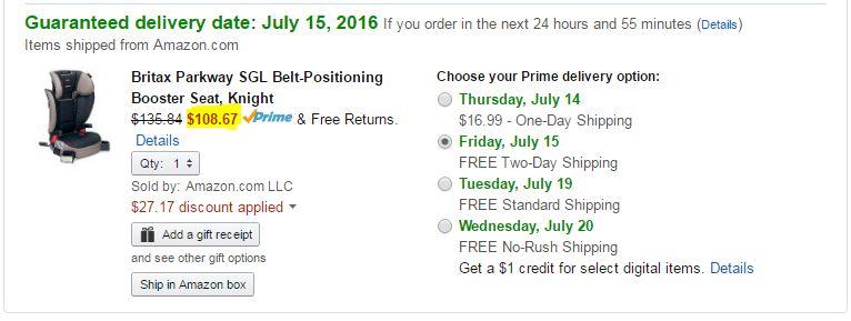 - 브라이텍스 파크웨이 SGL (Britax Parkway SGL Belt-Positioning Booster Seat, Knight, $108.67)
