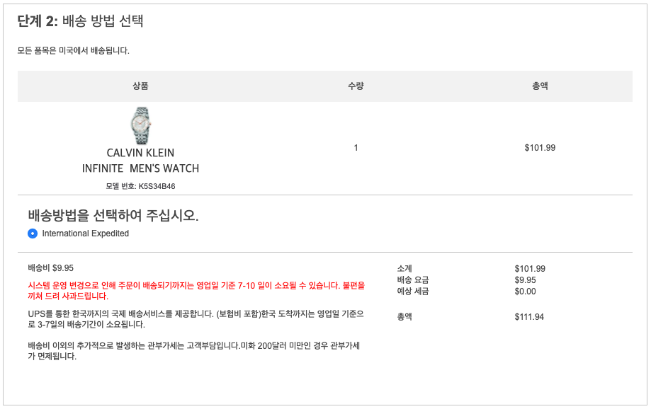 미국내 배송료는 무료, 한국으로 직배송은 9.95불입니다.