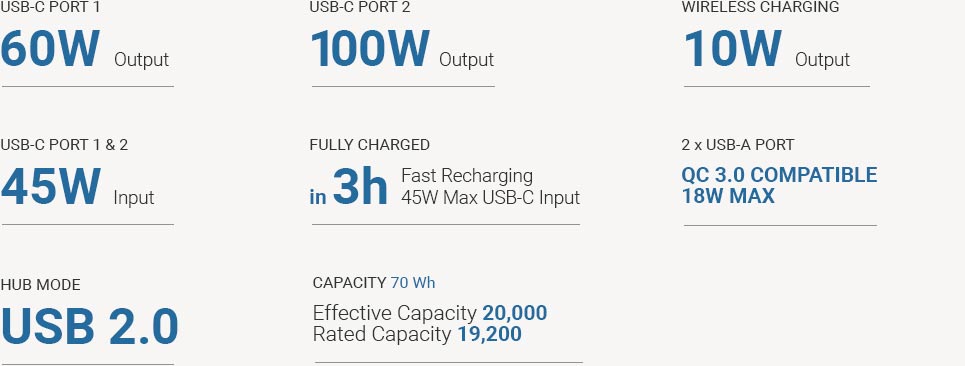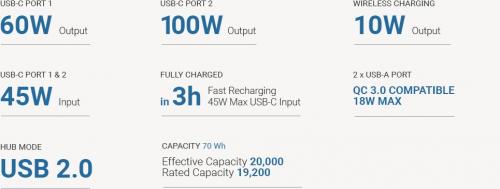 USB-A 포트는 퀵차지 3.0 출력을 지원하며, USB-C 포트는 각각 최대 60W와 100W 출력을 지원합니다.