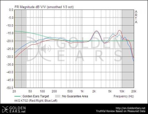 아래는 골든이어스에서 측정한 K702 주파수 특성입니다. (MC민지님의 블로그에서 가져왔습니다.)