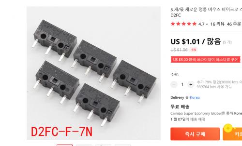 [알리] 5개 OMRON 마우스 버튼 스위치 D2FC-F-7N ($1.01/무료배송)