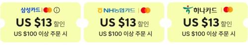 $100 이상 구매 시, $13 즉시 할인: NH농협 Mastercard, 하나 Mastercard, 삼성 Mastercard