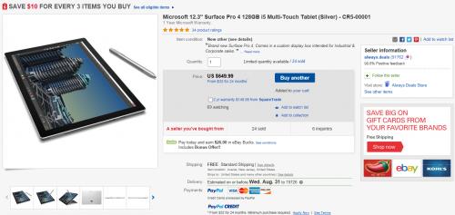 Note: Per the 128GB listing: “Brand new Surface Pro 4. Comes in a custom display box intended for Industrial & Corporate sales. Comes with a 1 year Microsoft warranty.” Per the 256GB listing: “This item Is a Brand New Surface. Comes in a Custom Display box intended for Industrial & Corporate sales. 1 year Microsoft Warranty”