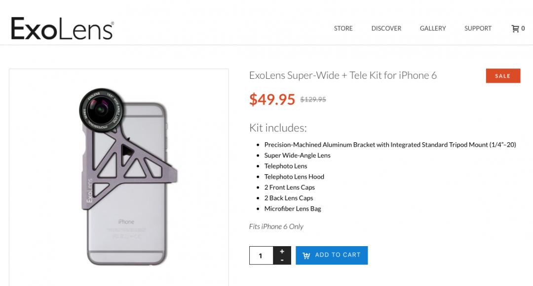 원래 $129.95 짜리 아이폰 6용 ExoLens 2-in-1 키트가 $49.95 에 할인 판매하고 있네요.