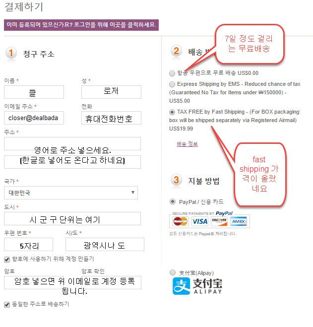 국내 쇼핑몰이랑 동일합니다. 주소넣고 결제하시면 1주일 정도 후에 도착할 거에요. |