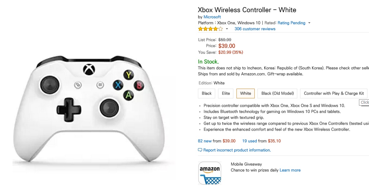 [Amazon] Xbox Wireless Controller 블루투스 지원 3세대 ($39.00 / 4.98 or 프라임 FS) > 해외핫딜