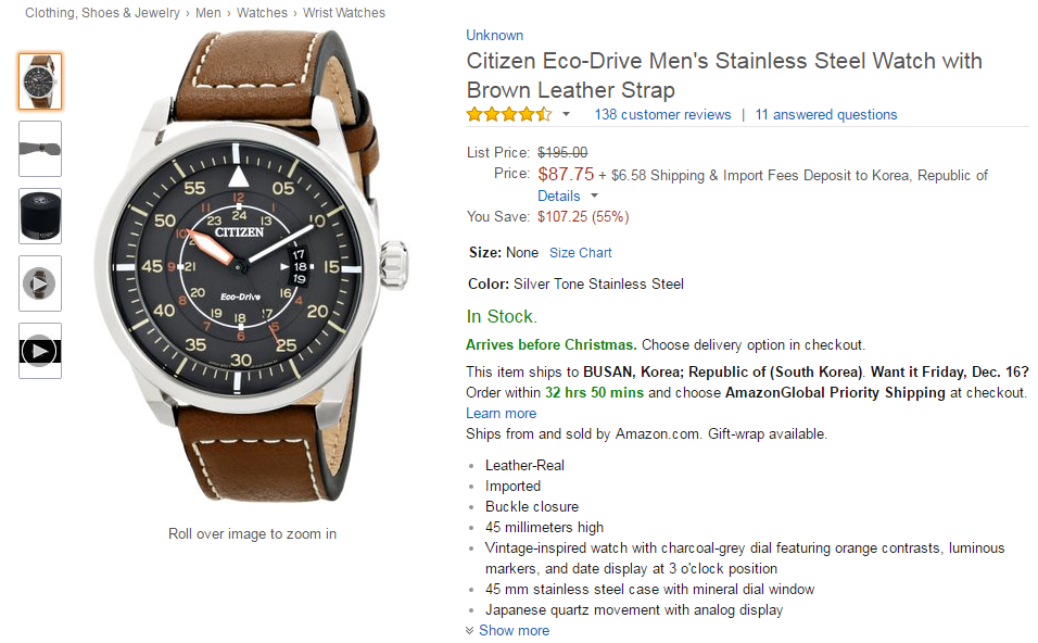[amazon] Citizen Eco-Drive Men's Stainless Steel Watch with Brown Leather Strap ($87.75/직배$6.58) > 해외핫딜