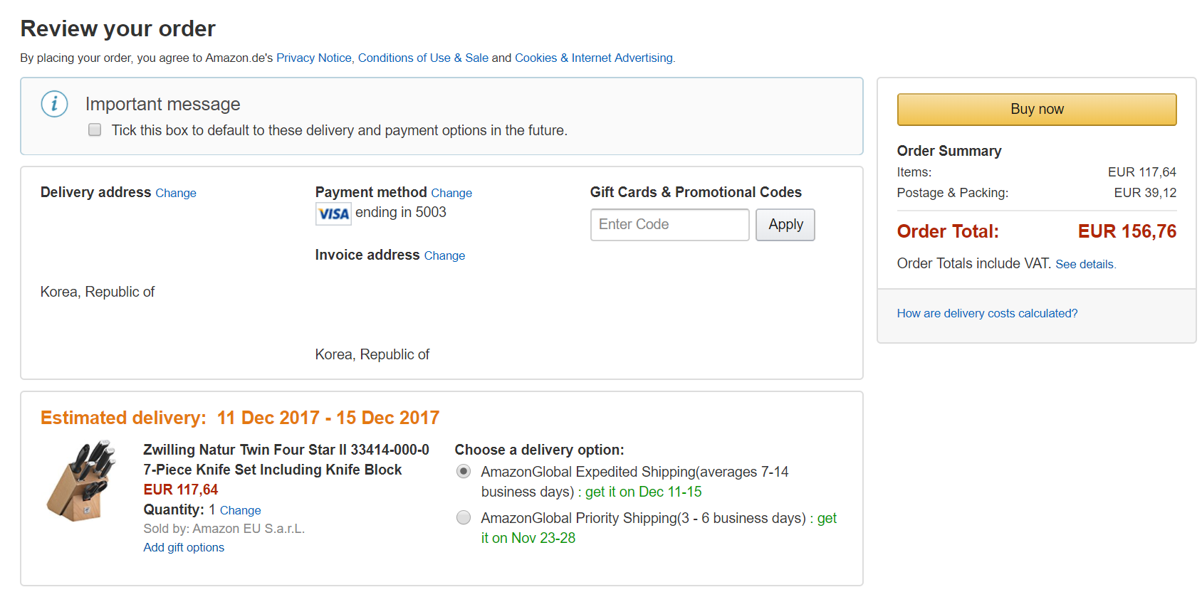 한국까지 보내는 경우 가격은 117.64 유로 배송료는 39.12유로입니다. (상품 가격이 150달러 이하라 무관세)