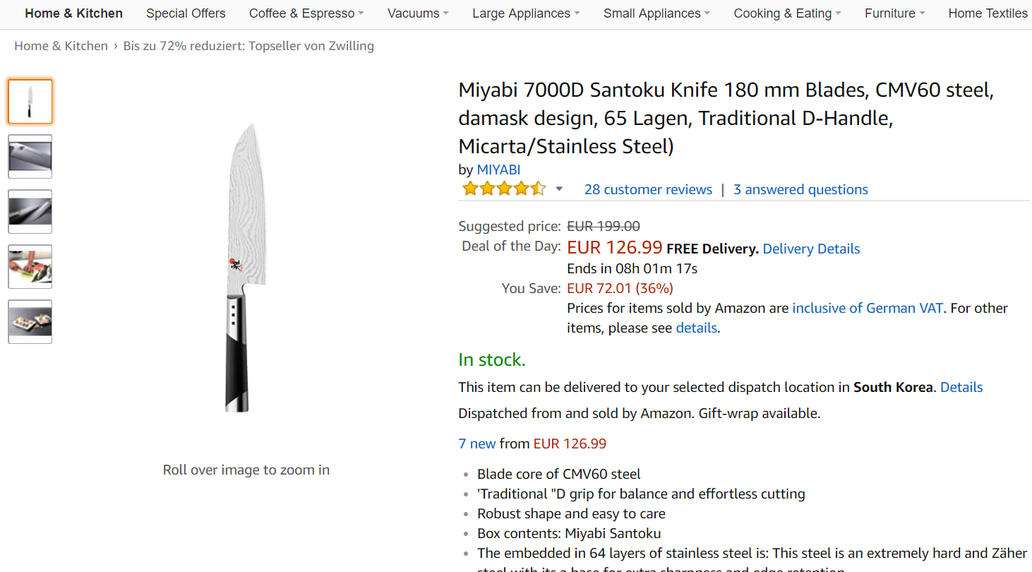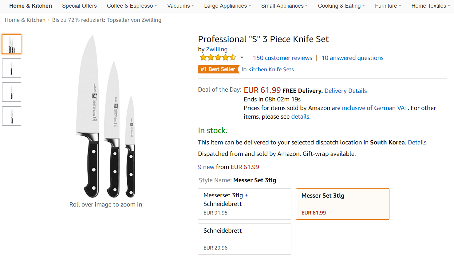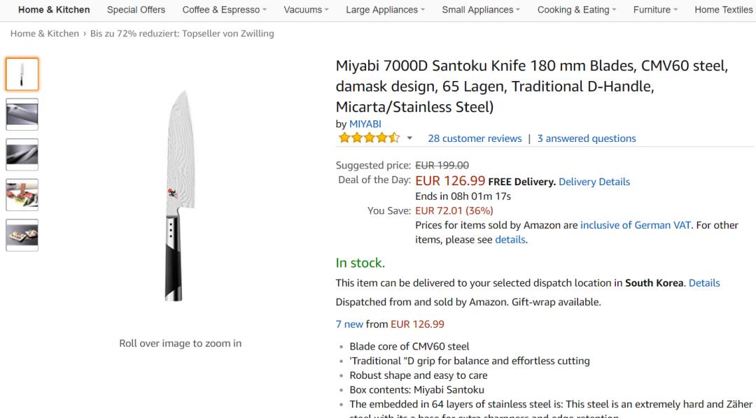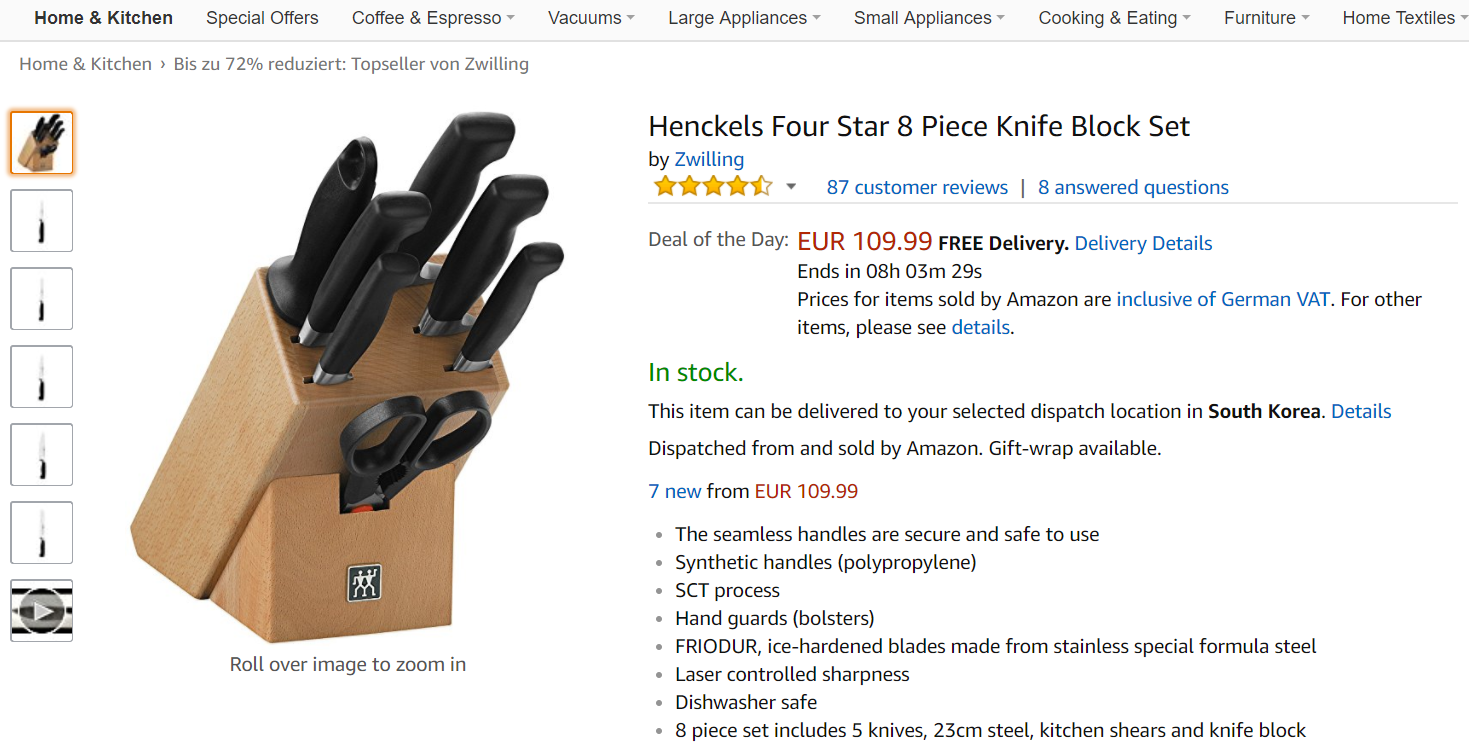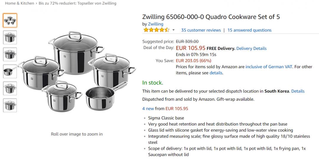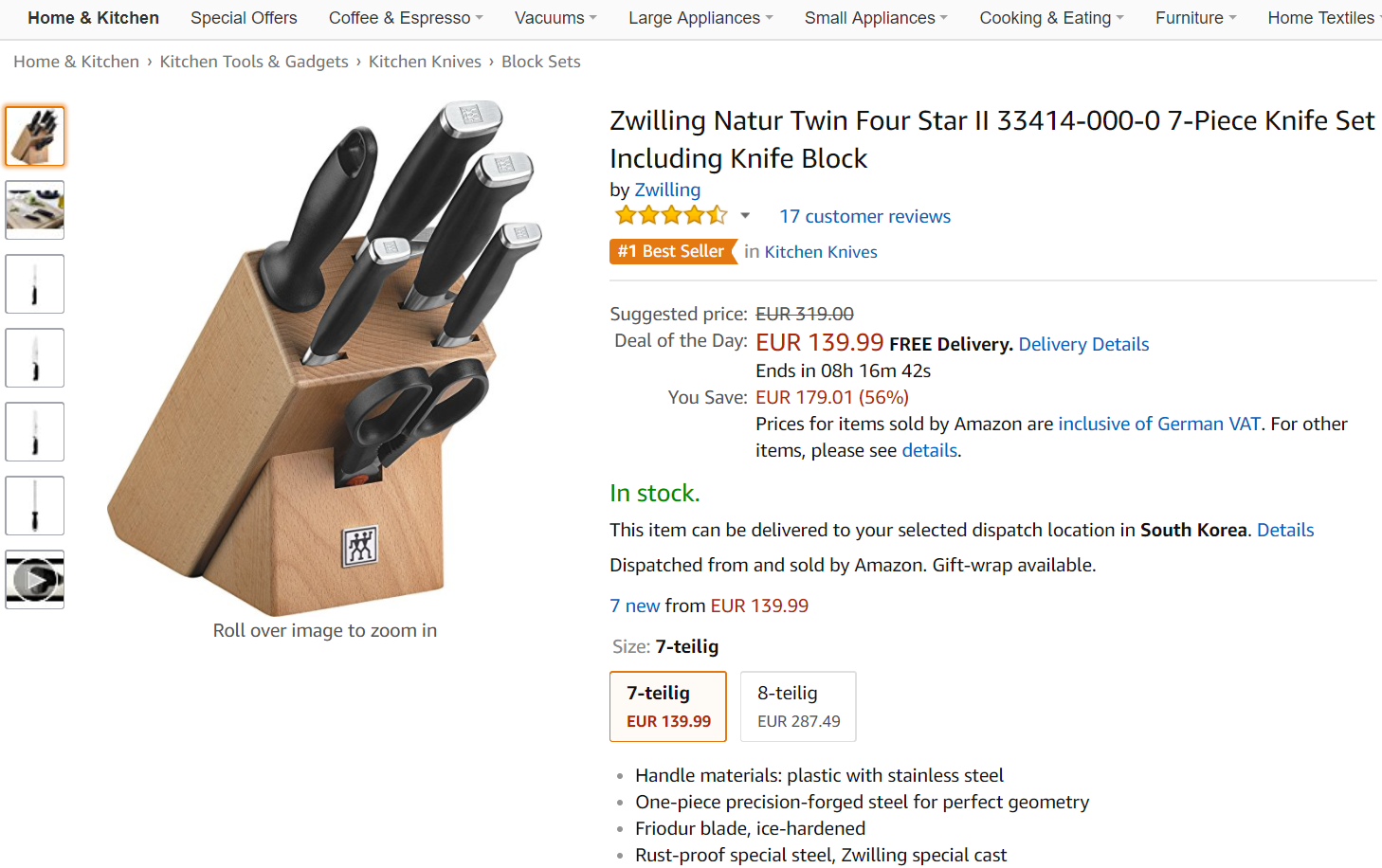 독마존에서 쌍동이 칼로 유명한 Zwilling 4스타 (최고 등급 바로 아래 등급이라고 합니다.) 타임 세일 중입니다.